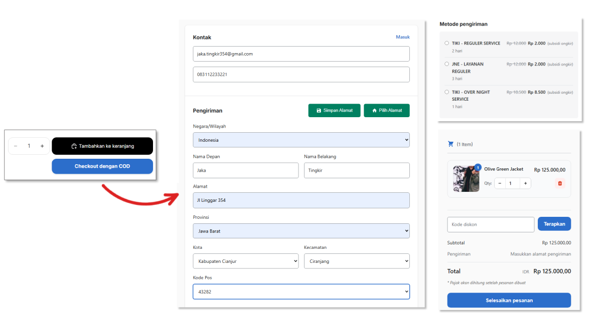 Pelanggan yang sudah login bisa menyimpan alamat pengiriman mereka. Checkout berikutnya jadi lebih cepat tanpa perlu isi ulang data.
